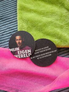 Nienke en Rico hebben samen nog een heel lang gesprek gehad over de viltjes die op de tafels zouden komen te liggen, omdat ze nog niet zeker wisten of ze wel of geen alcohol wilden gaan schenken. Rico verteld ‘want aan de ene kant is het raar om alcohol te schenken omdat ik over mijn verslaving met drugs en alcohol ga praten, maar drinken jullie maar lekker alcohol hoor. Maar aan de andere kant, wie ben ik om te bepalen wat jullie drinken, dus uiteindelijk hebben we ervoor gekozen om het wel te laten schenken en tóén hebben we die bierviltjes bedacht met op de voorkant mijn foto en op de achterkant de tekst die wij door Rico voor gedragen krijgen ‘Mijn geest en lichaam zijn niet tegen gif bestand, ik wil niet forever zinloos moven in een loep net als een gifbestand’ ….