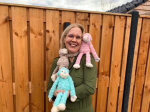 Wat een leuke vraag! Ja zeker, de plannen van Koffertje Troost zijn begonnen met het aapje! Ik zei tegen m’n dochter Ruby (die vanaf dag één intensief betrokken is bij de plannen en realiseren van het concept Koffertje Troost): “Ik wil dat kinderen letterlijk omarmd worden en getroost worden in hun verdriet.” Ik maakte toen een gebaar van omhelzen…deze omhelzing gaf zo de kern weer van mijn wens voor de kinderen! Ik ben vanuit die intentie op zoek gegaan naar een knuffel wat die droom van mij waar kan maken in de praktijk! Na een intensieve zoektocht stuitte ik op dit aapje en was in één klap verliefd en ben dat nog steeds! 😊 Ruby is vanuit deze kerngedachte toen aan de slag gegaan bij het ontwerpen van een logo en ja het resultaat kan niet mooier al zeg ik het zelf!