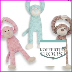 Het logo en toch wel de mascotte van ‘Koffertje Troost’ is het slingeraapje, helaas heeft hij/zij (nog) geen naam, maar daar kan het kindje waar hij/zij bij terecht komt vast wel iets op verzinnen. Het knuffelaapje is er in 3 kleuren, mint groen, rose en beige.