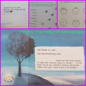 Ook lees ik het boekje ‘vaarwel, mijn boekje vol herinneringen’. Dit is een invulboekje dat jouw kind helpt om de herinneringen te verzamelen van de overleden geliefde, zodat ze hem niet vergeten. Wat ik erg mooi aan dit boekje vindt is dat het niet zomaar een invulboekje is, maar het kindje echt laat nadenken en schrijven over zijn of haar gevoel zoals te zien is op de onderstaande foto