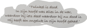 Dan heb ik ook nog een boekje speciaal dat gaat over zelfdoding, ‘twinkel en de wemelwolk’. Dit boekje beschrijft een vorm van zelfdoding waarbij sprake is van een impulsieve daad veroorzaakt door ‘kortsluiting ‘ in de hersenen, het mooiste dat Fladder hierover zegt is ‘de zelfdoding was geen vooropgezet plan van Twinkel, hij was buiten zichzelf, door kortsluiting in z’n hoofd.  Ik noem het daarom liever  een ‘buiten-jezelf-doding’, het was een ongeluk, in z’n hoofd’.