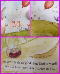 Mieke haar favoriet is een Big Hug boek en die heet ‘het leven is als de wind’. Omdat je nooit weet waar de wind heen gaat is het een beetje hetzelfde als de dood, je weet niet wat er écht gebeurt met iemand als iemand doodgaat, dus is dat ook zo’n beetje als de wind. Een prachtig boekje met vooral aquarel tekeningen erin, heel mooi.