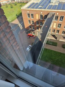 Buiten aangekomen was het de vraag of het een oefening of serious business was….en daar sta je dan, de tijd weg te kijken omdat we natuurlijk wel op tijd bij de sportschool wilden zijn.