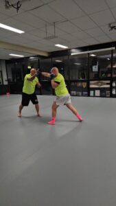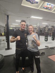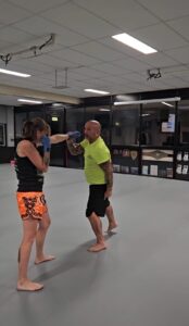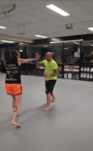 Hij trainde ons tegelijk, dus hij nam eerst mijn man op de pads om te kijken wat hij kon, met daarbij wat uitleg of tips, en dan draaide hij zich om naar mij en deed hij bij mij hetzelfde.