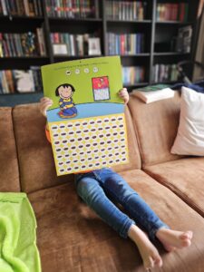 De tekeningen op de kalender en in het boekje vind Bodi erg mooi gemaakt, en het lettertype vind ze ook erg leuk. Ook vind Bodi het heel handig dat mama bij de kalender kan zeggen ‘plak maar bij de vlinder’, omdat er boven elke dag een ander plaatje staat.