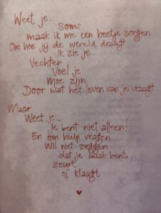 De ’tussendoor gedichtjes’ zijn gericht aan de lezer als hart onder de riem en ze zijn mooi, ze raken je. Alle gedichtjes zijn ‘op de typemachine’ geschreven, behalve die tussendoor gedichtjes, die zien er allemaal anders uit, en veelal lijken ze ‘handgeschreven’.