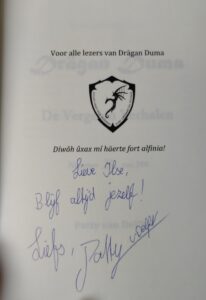 De vergeten verhalen zijn een aanvulling op de serie Drägan Duma van Patty van Delft. De cover geeft je niet meteen het idee dat je weer terug gaat naar de wereld van Drägan Duma (<— Booktrailer), maar het is toch echt zo. Ik heb de serie jaaaaaren en jaren geleden gelezen, toen ze net uit was, dus eerlijk gezegd zou ik alles opnieuw moeten lezen om alles weer écht helemaal perfect te weten. Maar feit wil dat Patty op zo’n manier haar verhalen schrijft, dat ik meteen weer terug ben in Drägan Duma en dus niet perse nú alles weer moet lezen (al zou ik niets liever willen, want DD is één van mijn favoriete series).