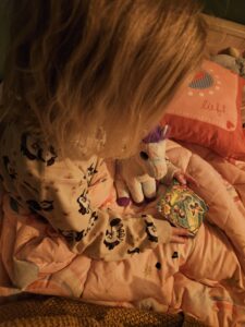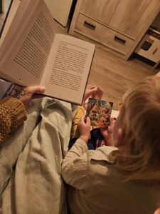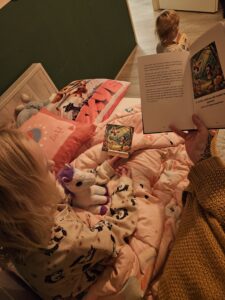Hieronder zie je ons bed ritueel (als ze dat willen), allebei even een kaartje trekken, ieder zijn eigen verhaal voor het slapen gaan