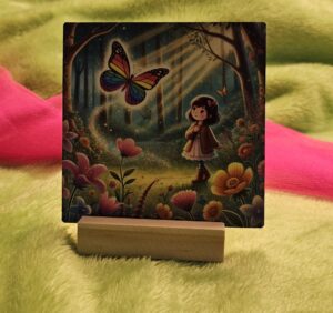 Mijn dochter mocht één kaart uitkiezen die zij mooi vond voor in onze recensie, en zij koos deze kaart omdat ze gek is van regenbogen (eenhoorns wonen daar hé) en vlinders (een bijzonder verhaal in onze geschiedenis).