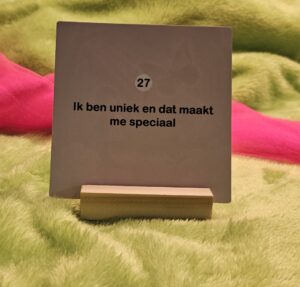 Een kleine greep uit de 30 verhaaltjes en affirmaties zijn bijvoorbeeld, ‘ik volg mijn hart’, ‘ik ben bijzonder’, ‘ik geloof in mijzelf’, ‘ik ben sterk en kan alles aan’… ga zo maar door.