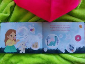 Hieronder heb ik de twee favoriete bladzijden van Bodi geplaatst, Bellen blazen met Pluis (volgens Bodi is het ‘buiten blazen’) En de regenboog maken