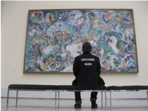 Zijn alter ego is de ‘Watching man‘, een man met een zwart jack met daarop de woorden Watching man in hoofdletters, die voor het eerst verscheen tijdens een André Smits show in Nijmegen in 2016. Het eerste echte hoofdstuk (in mijn ogen het eerste echte hoofdstuk dan) is ‘krakend parket’ en ik vind dat een ontzettend mooi begin van een boek als dit. Baudoin verteld je namelijk om zélf over de kunst die je ziet na te denken, te oordelen en te kijken met je eigen ogen, in plaats van klakkeloos af te gaan op wat de zogenaamde critici zeggen, de feitjes die worden neergelegd of voorgekauwde meningen die je tegenwoordig om de oren vliegen.